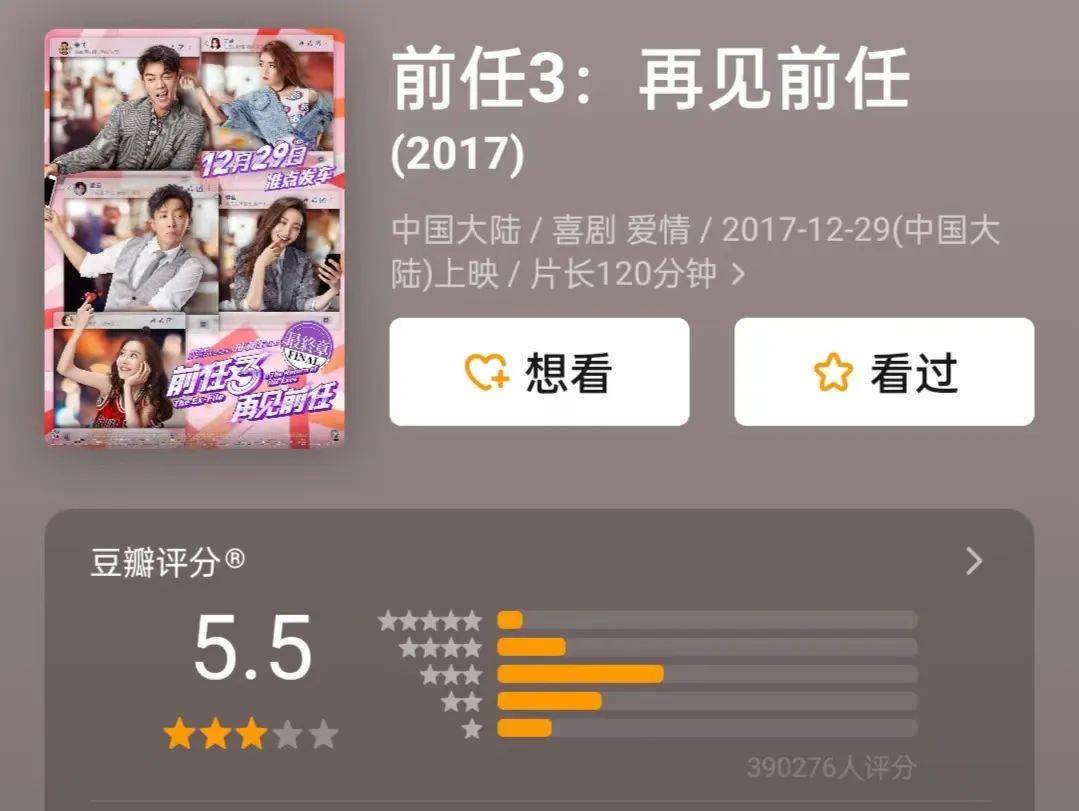 至于《前任4》,除了韩庚发腮,这部片子从开拍起就争议不断,因为前三部的口碑比较一般,评分都不高,第一部6.1分,第二部5.2分,第三部5.5分。