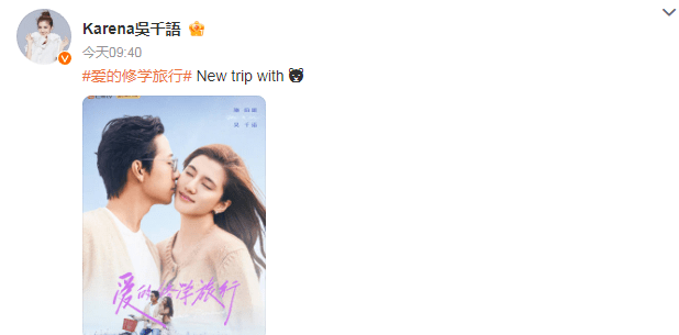 11月20日,吴千语晒照宣传与富三代男友施伯熊录制《爱的修学旅行》新综艺,首次合体上节目的两个人吸引不少网友关注。