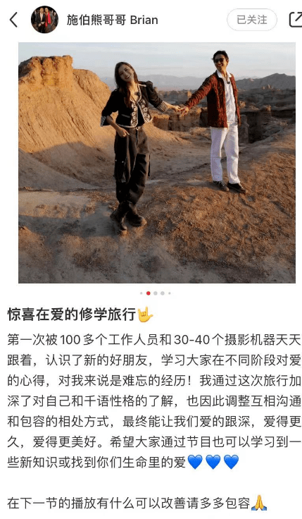 而在节目开播之后,施伯熊晒出与吴千语录制节目时拍摄的多张恩爱合照,作为圈外人,陪着女友一起录综艺的他表现自然大方,施伯熊称第一次被100多个工作人员和三四十个摄影机器天天跟着,认识了新的好朋友,学习大家在不同阶段对爱的心得,这让他和吴千语爱的更深更久,爱的更美好。文末,施伯熊还谦逊表示希望大家多多包容。不愧是豪门出身,言谈举止间足以让人感受到他的修养与内涵。
