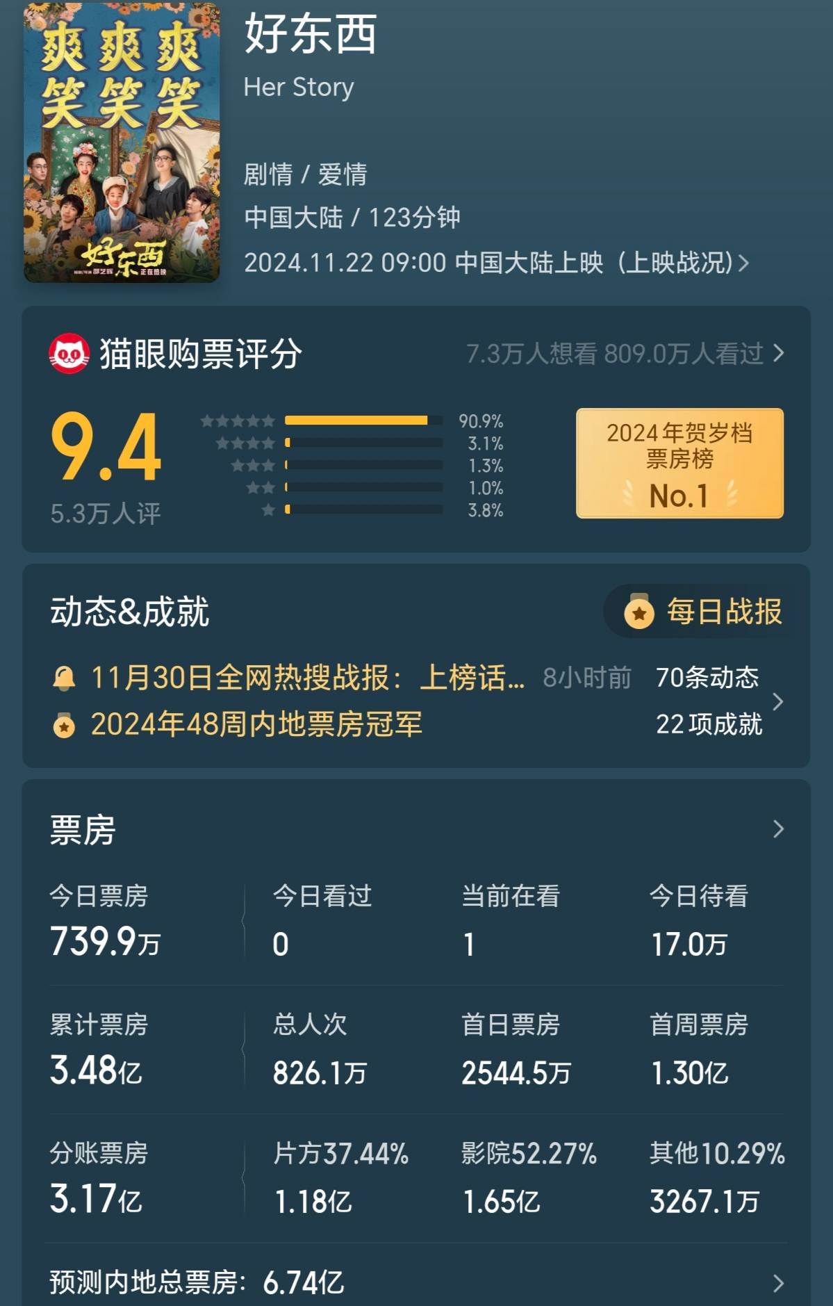 搜狐娱乐讯 (哈麦/文)《爱情神话》导演邵艺辉执导,宋佳、钟楚曦、章宇、赵又廷等主演的都市轻喜剧《好东西》随着口碑发酵票房一路走高,上映第二个周六,单日票房突破了6100万元,同比上周六逆跌20%,创下单日新高。正式上映九天加上超前点映累计票房过了3.4亿元。按此走势,猫眼专业版将其最终预测总票房进一步调高到了6.74亿元。