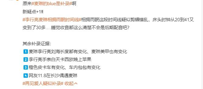 通过网友的观察,最新更新的好友撑腰以及同床和解片段,不仅时间线混乱,还发现李行亮所戴手表、麦琳的包以及两人头发长度的差异,再加上节目组没有第一时间放出麦琳好有撑腰的预告以及两人睡觉没有遮摄像头等细节,质疑节目组后期补录了这些片段,务必要挽回麦琳的形象。
