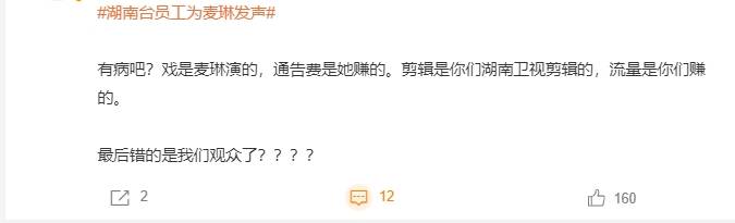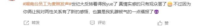 显然,这位芒果在职员工敢亲自露脸对麦琳风波发表看法,一定是经过平台领导同意的,不排除是通过授意的工作。而她发声的目的也非常明确,就是下场维护麦琳,想要尽可能平息这场风波。但结果不尽人意,网友非但没能因此放过麦琳,还连节目组以及平台都吐槽了个遍。