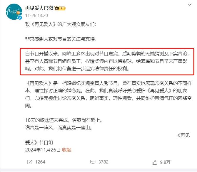 值得注意的是,如今网友对麦琳的吐槽已经从调侃上升到了人品,觉得她不是情绪化,而是本身就坏。眼看着麦琳风评越来越差,《再见爱人》官微下场发声,表面是在辟谣重新剪辑、离职剪辑等网传爆料不实,实际是在委婉维护麦琳,呼吁大家理智观看综艺。