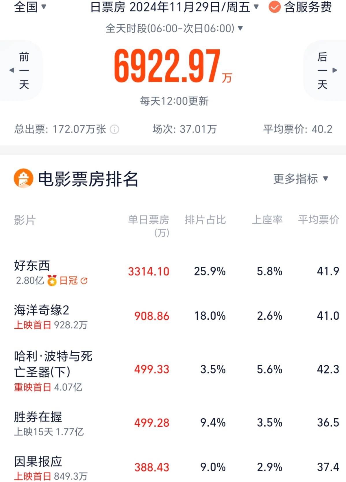 好莱坞动画《海洋奇缘2》上映首日排片占比18%,收票房909万元,上座率2.6%,偏低,远不及《哈利·波特与死亡圣器(下)》的5.6%和《好东西》的5.8%。