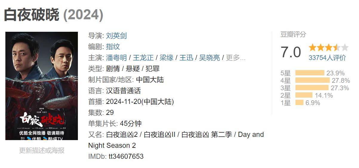 尽管豆瓣7.0的开分与第一季相差甚远,但《白夜破晓》在某些方面还是与第一季保持着一致的水准,尤其是潘粤明一人分饰两角的演绎,没有让人失望,再次惊艳四众!