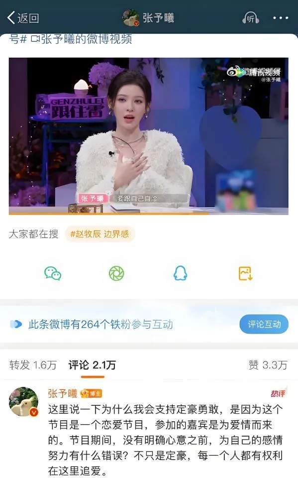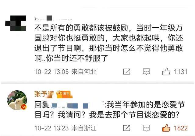 不过吃瓜要全面,不能只看万国鹏的一面之词。有网速快的网友发现张予曦也曾公开回应过《一年级》被万国鹏疯狂追求的事件。甚至还贴出了张予曦的回应。其实,张予曦原本已经不在乎万国鹏那档子事情了,会在多年后澄清只是因为她在参加恋综《心动的信号》时,多次鼓励让节目男嘉宾勇敢追求意中人,不要因为喜欢的人已有暧昧对象就退却,并且在过程中一直表示自己很心疼这个弟弟。