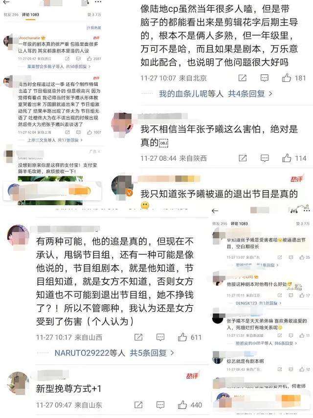 有网友相信万国鹏的说法,当然也有部分网友对万国鹏都是剧本的说法存疑。毕竟张予曦害怕厌恶的反应太真实了,不像是演的。如果说张予曦当时的反应都是配合节目组表演的话,那简直可以纳入北影教科书了。况且事情过去这么多年,张予曦已经不会再被那件事情影响到了,现在还有新剧在播。万国鹏这个时候旧事重提免不了蹭热度的嫌疑。