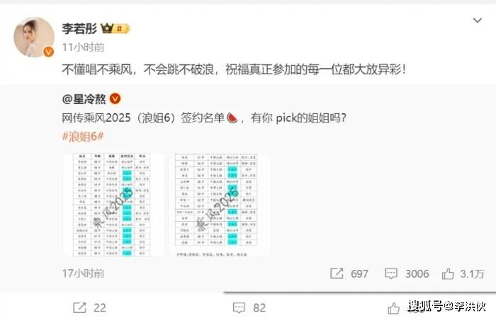 11月27日,李若彤在社交媒体上回应:不会唱不乘风,不会跳不破浪,祝福真正参加的每一位都大放异彩。
