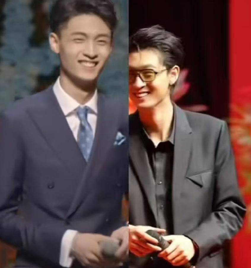 2019年,他走的还是温文尔雅的路线,穿黑色西装,搭配整齐的短发,笑得很斯文,给人感觉还是非常青春帅气的小奶狗。