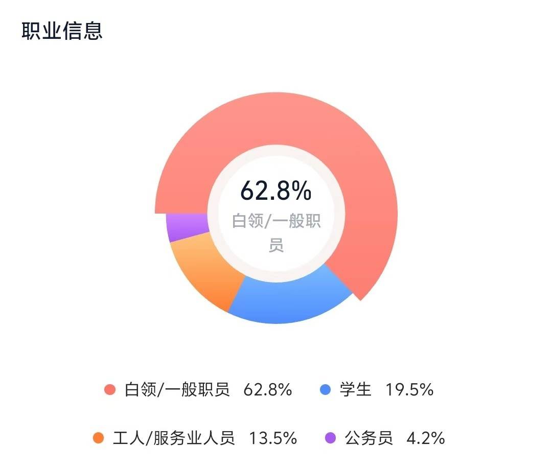 在《风流一代》的受众用户中,白领及一般职员的比例,高达62.8%。这样的数据构成,还是很让人惊讶的。众所周知,一线城市因为文化、科技产业高度发达,也成为了文艺属性、高知文化人群的聚集地。但贾樟柯作品的受众,更倾向于高端人群,也是不争的事实。