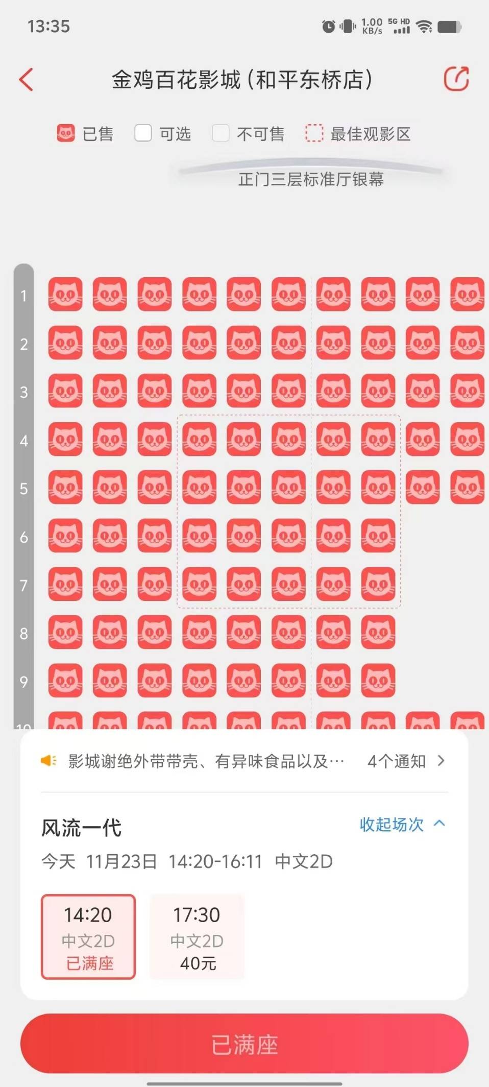 与此同时,首映当日《风流一代》在北京也被观众热捧,战台烽本来计划去离家最近的金鸡百花影城观影,却发现14:20的场次已经满座,而战台烽常去的安贞环宇荟华夏影城和中影华宇国际影城的上座率,也大约在40%……