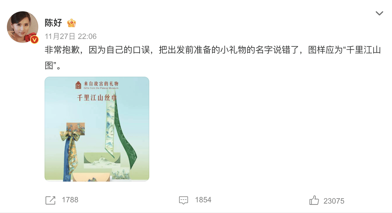 陈好为《花少》中口误道歉:图样应为《千里江山图》