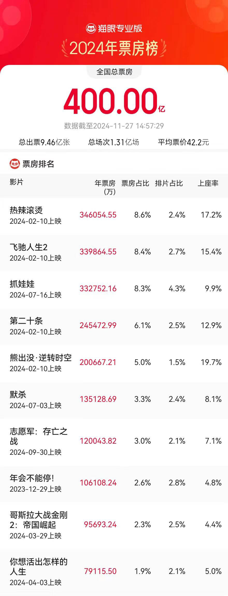 搜狐娱乐讯 据猫眼专业版数据,截至2024年11月27日, 2024年中国电影总票房(含预售)突破400亿,观影人次达9.46亿,总场次达1.31亿场。《热辣滚烫》《飞驰人生2》《抓娃娃》暂列年度票房前三名。