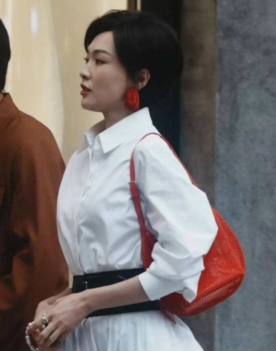 她穿着一件白色衬衣,很符合人物在剧中的设定,但是从路透图来看,她的状态很不乐观,脸显得有些浮肿和僵硬,能够看得出很强的年龄感。
