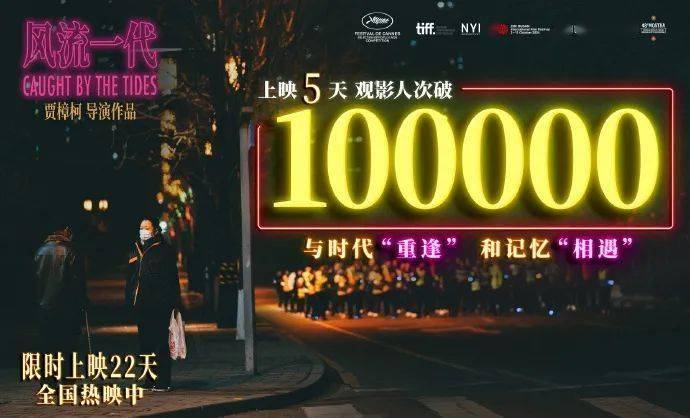 由贾樟柯执导、赵涛主演的时代爱情片《风流一代》上映5天,观影人次破10万。很多年轻观众表示影片让他们看到了父母年轻时的样子,得以窥见他们在这20年间的变化;更有观众表示,《风流一代》是在漫长的时间里,时代洪流对人的裹挟的清晰显影。影片由赵涛、李竺斌主演,潘剑林、兰周联合主演,限时上映22天。