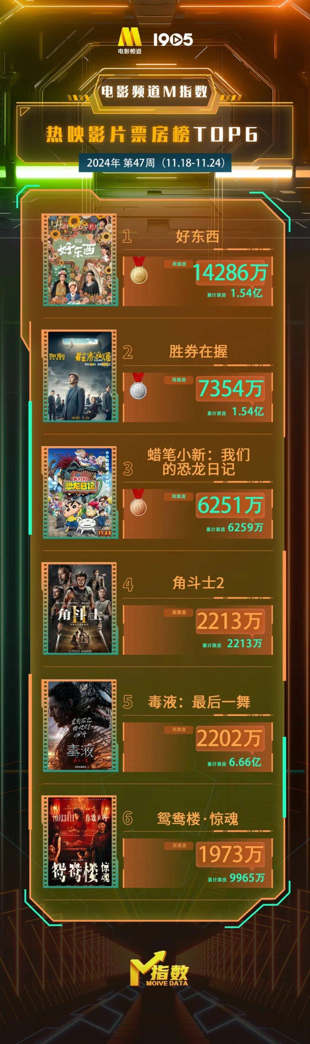 电影频道M指数2024年第47周结果发布。11月18日-11月24日,电影频道M指数热映影片票房榜前6位依次为:①《好东西》周票房14286万;②《胜券在握》周票房7354万;③《蜡笔小新:我们的恐龙日记》周票房6251万;④《角斗士2》周票房2213万;⑤《毒液:最后一舞》周票房2202万;⑥《鸳鸯楼·惊魂》周票房1973万。