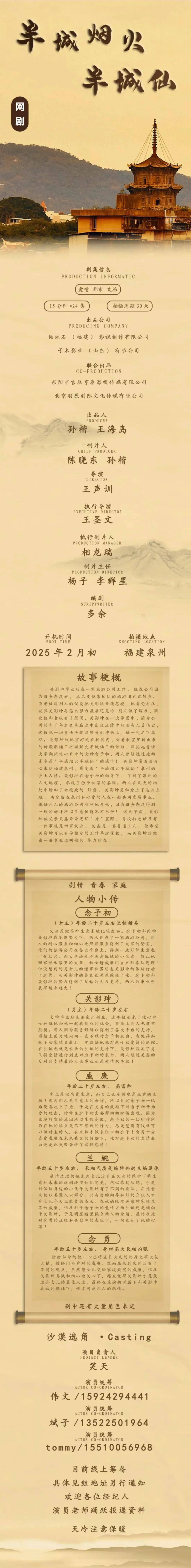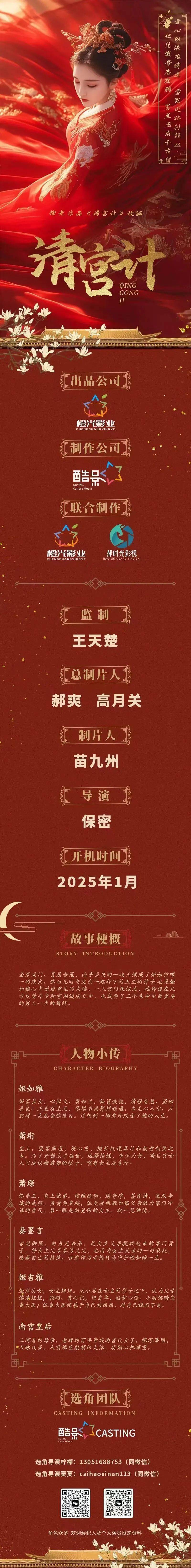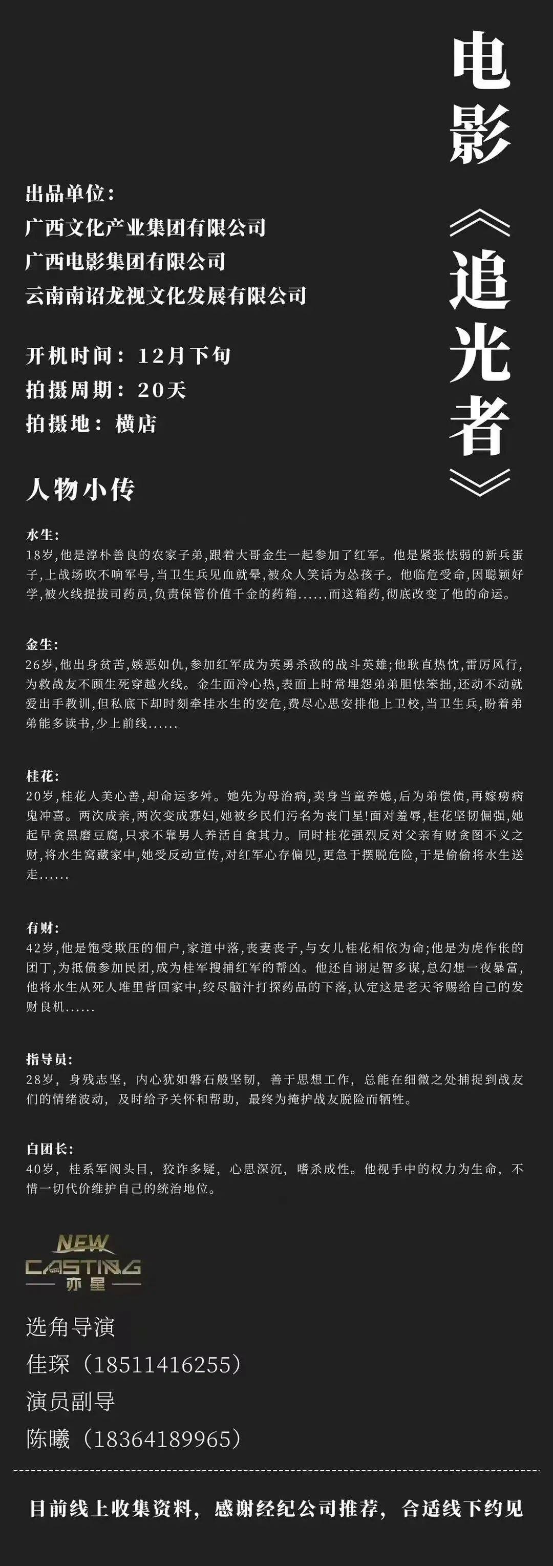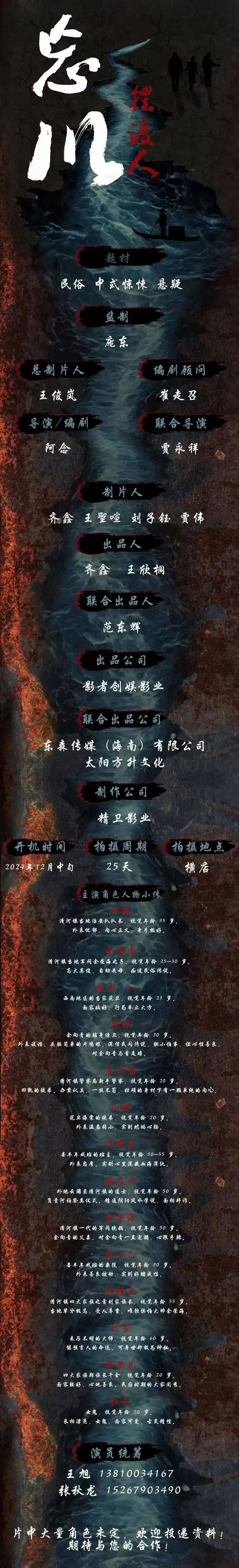 免责声明:戏客Seeker公众号(“本平台”)中全网组讯的信息、内容(“组讯信息”,包括但不限于影视项目名称、项目介绍信息、出品公司信息、导演信息、选角团队信息、拍摄相关信息、联系方式等)均来源于内容信息相关方提供或互联网公开信息。本平台不对组讯信息的真实性、准确性、完整性、及时性、关联性、适用性及安全性提供任何明示或默示的担保。请您谨慎参考或使用组讯信息,并确保您的人身、财产安全,本平台不对您使用或参考组讯信息而造成的后果承担任何责任。