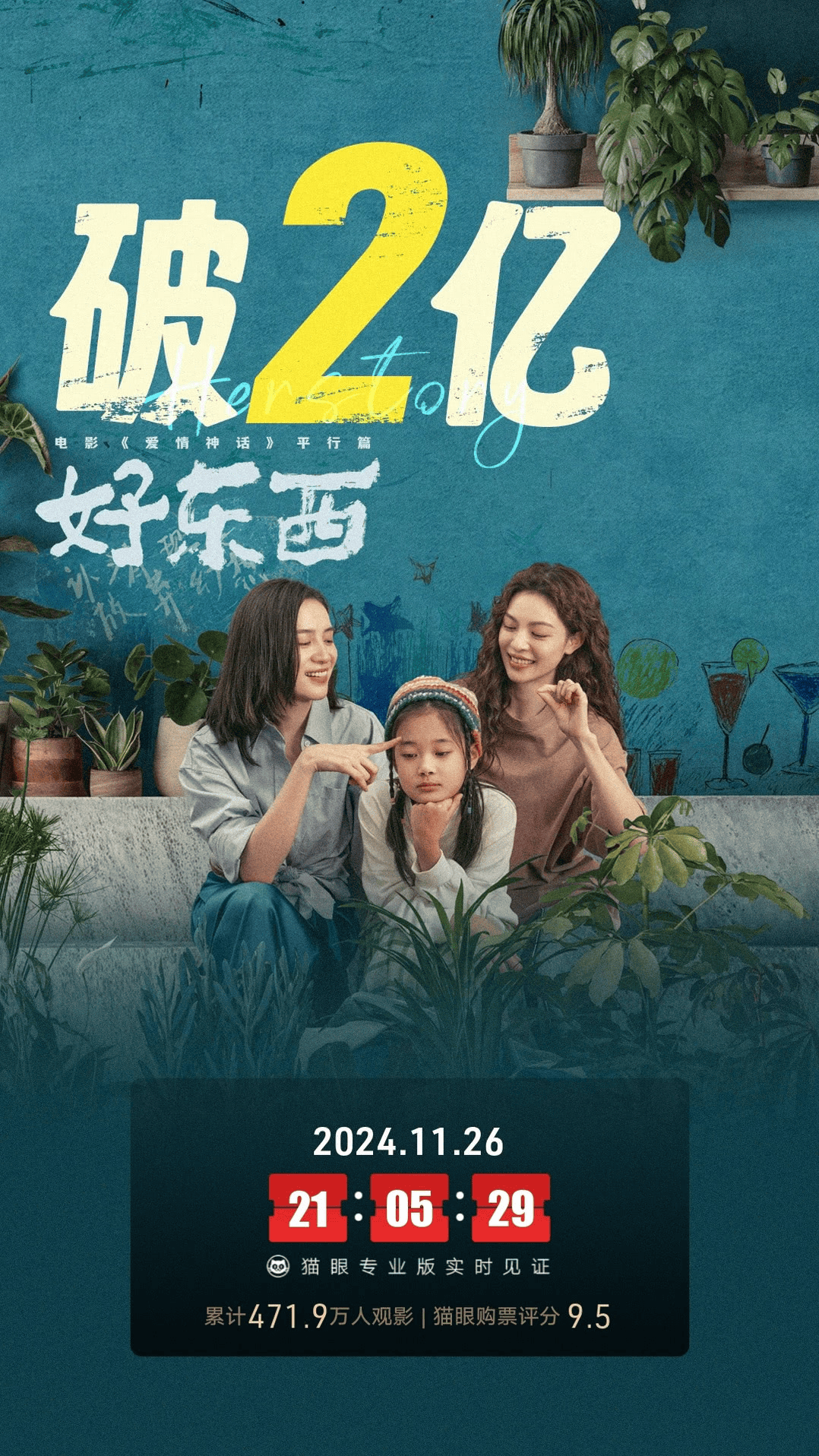 搜狐娱乐讯 据猫眼专业版数据,截至11月26日21:05,邵艺辉执导,宋佳、钟楚曦、曾慕梅领衔主演,章宇领衔主演,赵又廷、周野芒特别出演,任彬主演的都市爱情喜剧电影《好东西》上映五天(加点映)累计票房突破2亿,连续五天夺内地单日票房冠军。 累计观影人次471.9万。