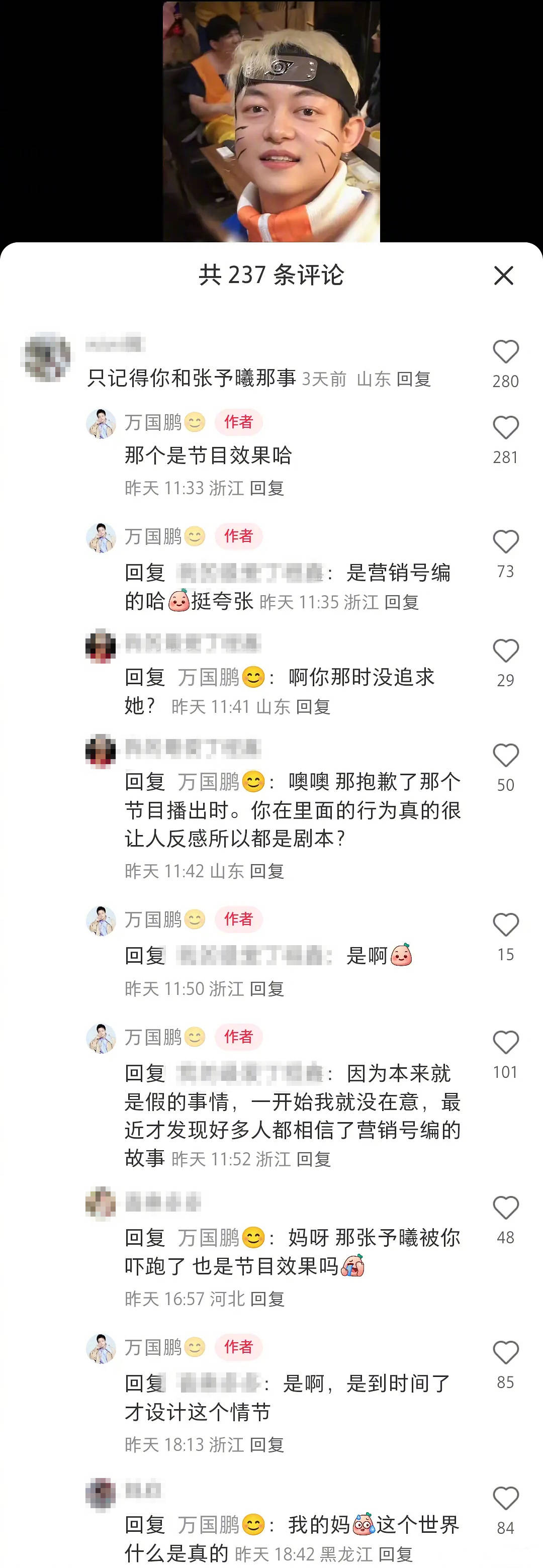 万国鹏表示:“因为本来就是假的事情,一开始我就没在意,最近才发现好多人都相信了营销号编的故事。”他说张予曦被自己表白吓跑也是节目效果:“是到时间了才设计这个情节!”