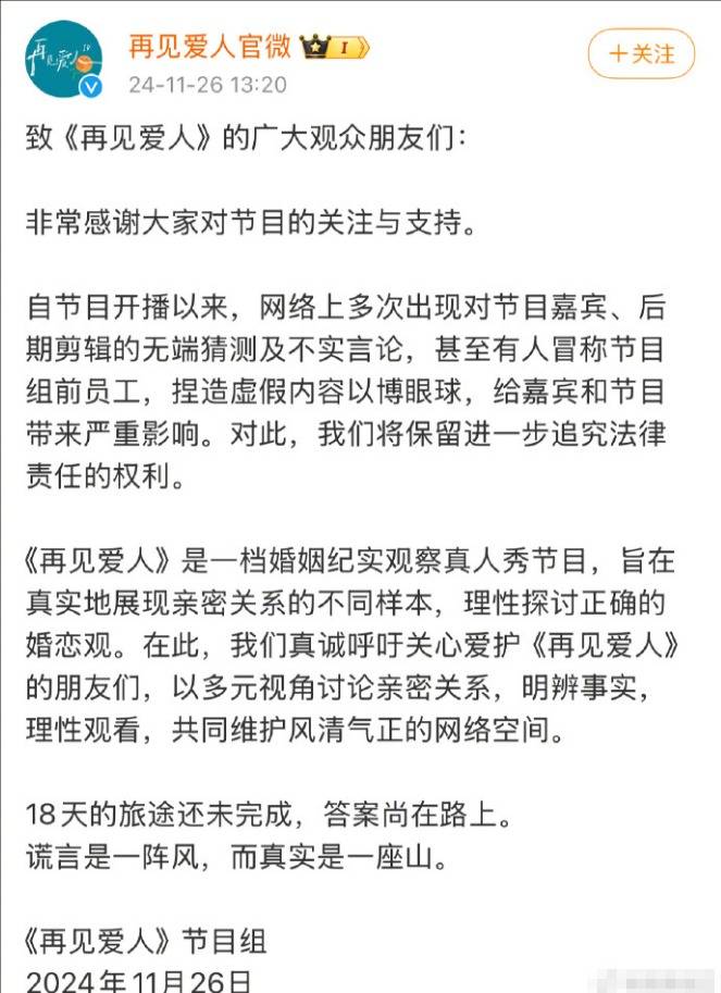 搜狐娱乐讯 11月26日, 《再见爱人》节目组发布一则声明,表示:“自节目开播以来,网络多次出现对节目嘉宾、后期剪辑的无端猜测等不实言论,甚至有人冒称节目组前员工,捏造虚假内容以博眼球,给嘉宾和节目带来严重影响。对此,我们将保留进一步追究法律责任的权利。”节目目前还在热播中,呼吁大家以多元视角讨论亲密关系,明辨事实,理性观看