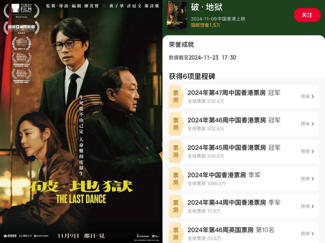 自11月9日公映以来,《破·地狱》仅用时两周便席卷6千万港元,将成为《毒舌大状》后又一部破亿港产片,再度印证黄子华的票房号召力。