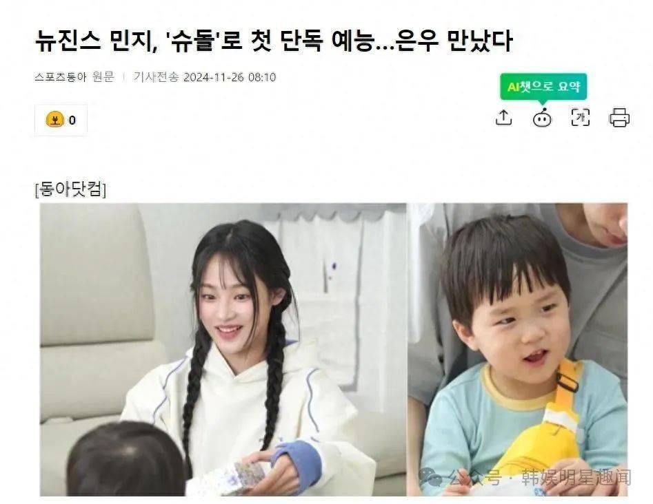 据韩国媒体11月26日报道,NewJeans成员金玟池MINJI将出演综艺节目《超人回来了》,这是她的首次个人综艺节目。是不是瞬间感觉周三的幸福指数要爆表了?MINJI可是咱们“宇兄弟”的忠实粉丝,这次直接圆梦和他们一起拍节目,可太让人期待了!