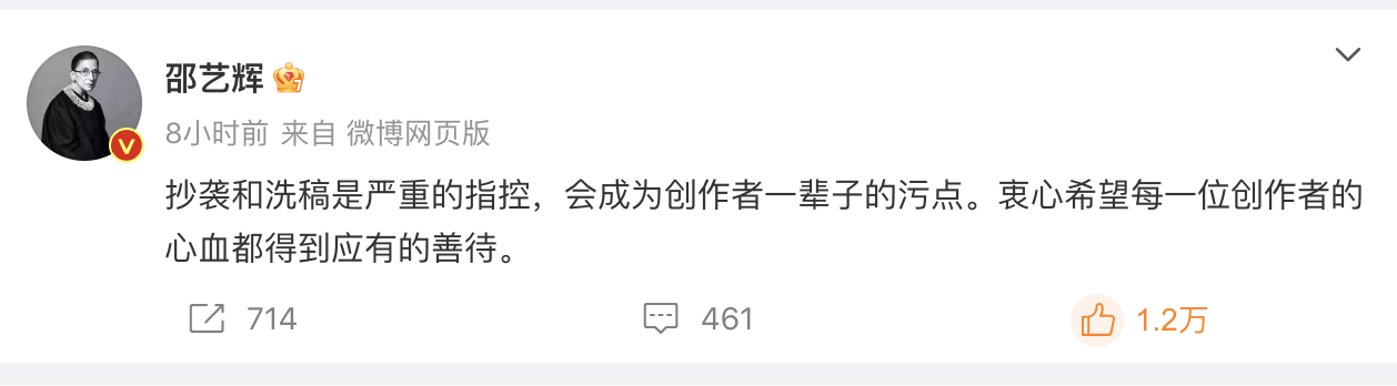 搜狐娱乐讯 25日晚,《好东西》导演编剧邵艺辉发文回应编剧侯蓓引起的争议:“抄袭和洗稿是严重的指控,会成为创作者一辈子的污点。衷心希望每一位创作者的心血都得到应有的善待。”