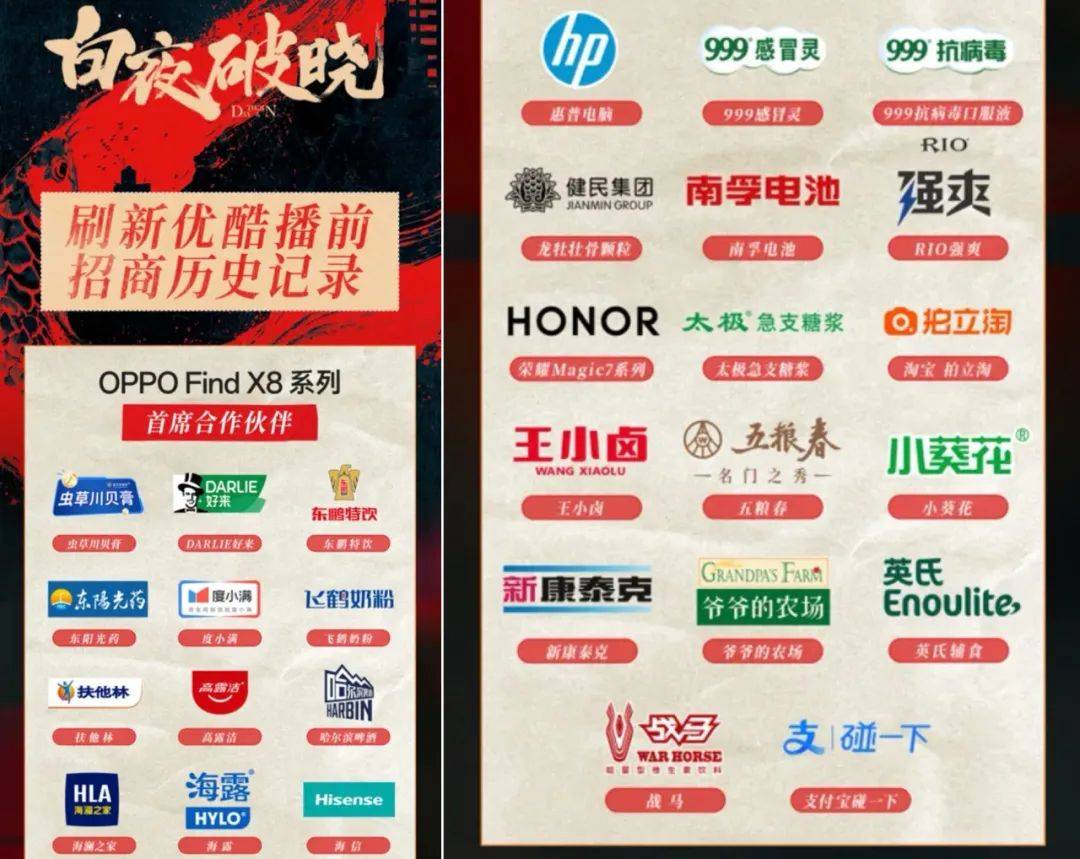 肉眼可见的,《白夜破晓》又为剧集广告开拓出很多新玩法,比如优酷APP首页封图右上角很抢眼的「首席合作伙伴:OPPO FindX8系列」字样,比如播前剧方就官宣了30 合作品牌刷新了优酷播前招商历史记录,比如第二季热播还带动了前季《白夜追凶》被追投单集5广……