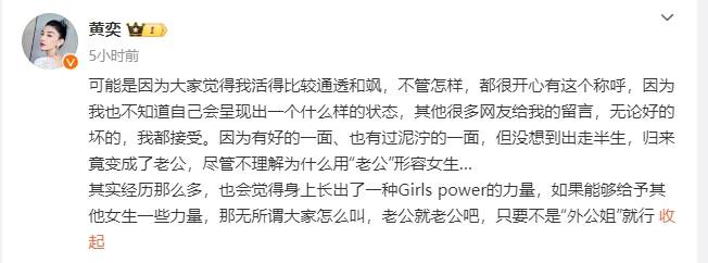 据悉,黄奕早年间曾在不少古装剧中女扮男装,被不少网友起了“老公姐”的绰号。