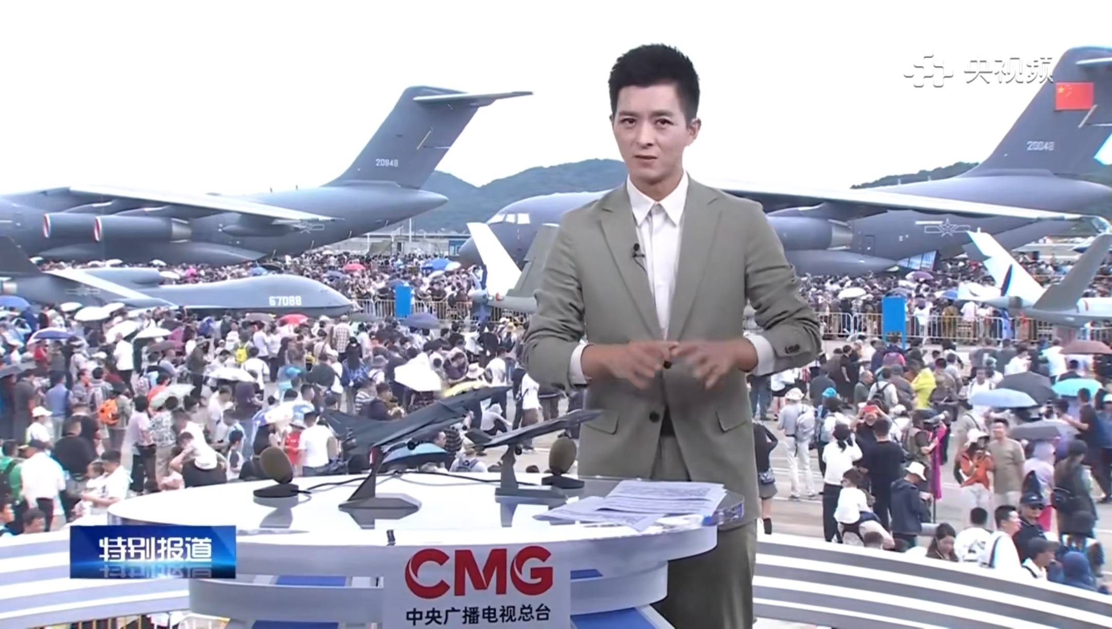 而且,王言还穿了一套灰色西装,内搭淡蓝色衬衫,颜值和气场都不输其他同场主持人。在《长空鹏程》室内主持的前一天,王言还在其他节目里与北京演播室主持人连线,到航展现场介绍人气展品的专业内容,同样也是言之有物,没有夸夸其谈,每句话都是经过深思熟虑的,业内人士一听就知道比较专业,一看就是有备而来的,绝不是无脑吹。
