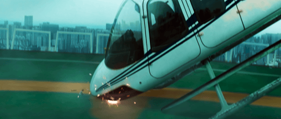 紧接着一架刚刚起飞的直升机,在空中因为打斗而失控坠落。