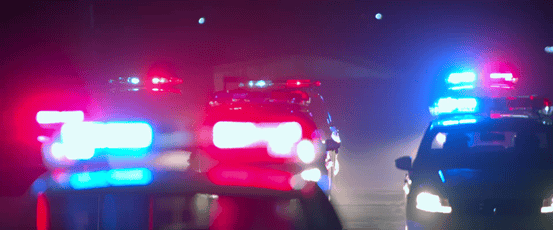 在灯火通明的都市夜景中,警车连续呼啸而过,轮胎摩擦地面发出尖锐的声响。