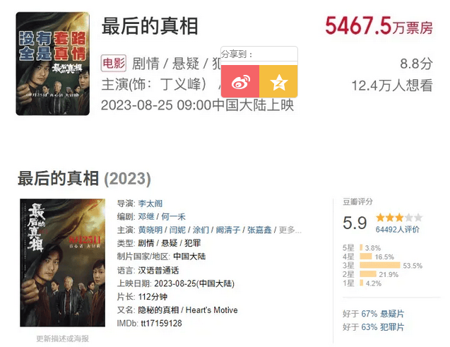去年《最后的真相》尽管有黄晓明、闫妮、涂们、阚清子、王影璐,最终仅获5400多万的票房,豆瓣评分5.9分。今年,《戴假发的人》只有黄晓明、王影璐、黄璐,而且口碑也不咋地!