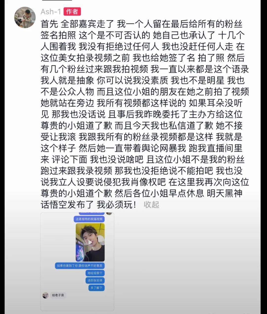 当时Ash1在演出结束后和粉丝合影,祝对方“尖锐湿疣”引发了巨大争议。当时Ash1回应并且道歉了: