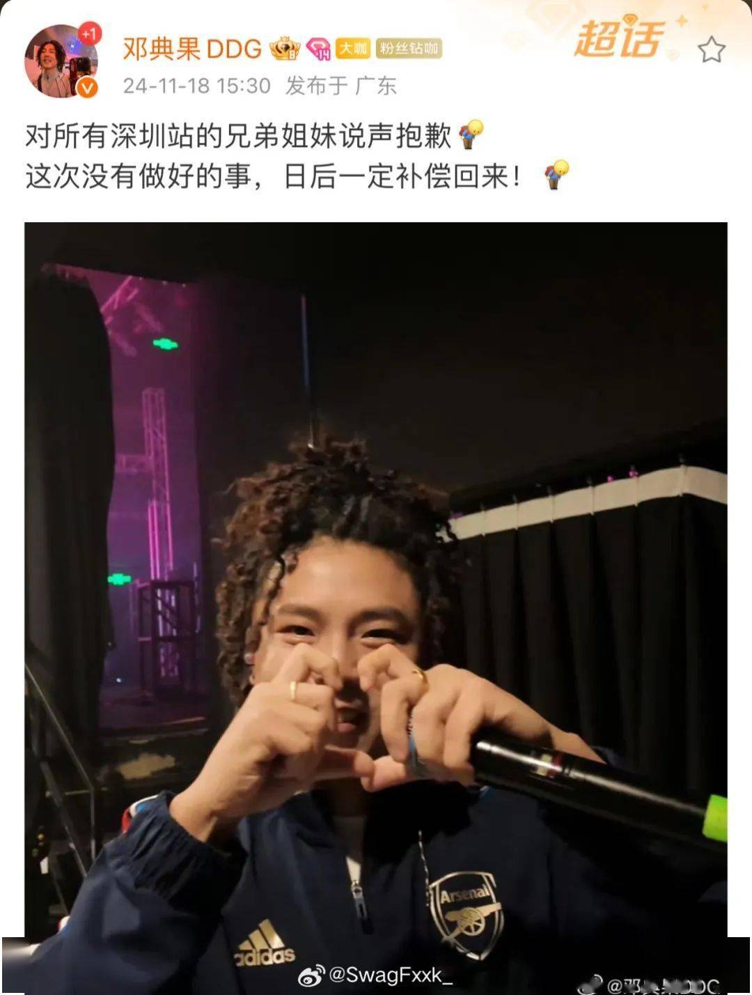 而就在今天,邓典果也发文回应了此事,为自己没法继续演出道歉:对所有深圳站的兄弟姐妹说声抱歉这次没有做好的事,日后一定补偿回来!