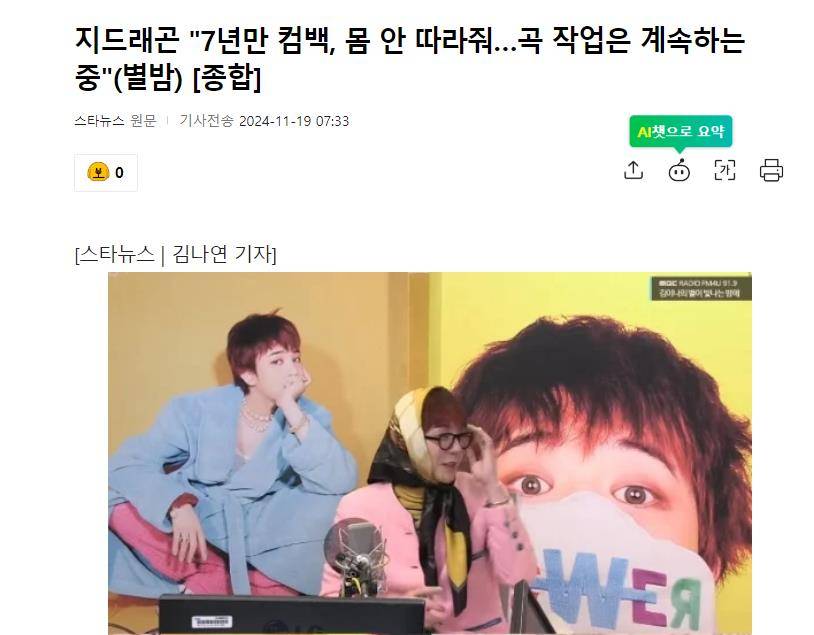 宝子们,听到韩国知名男星,权志龙G-Dragon上电台的消息,你们是不是和我一样,差点把咖啡喷出来?没错!11月19日,有韩国媒体报道,18日,志龙欧巴作为嘉宾现身《金依娜的繁星点点》,这可是他久违的电台亮相!而且,这次志龙不仅带来了他的迷人气场,还顺带贡献了满满的羞涩瞬间,让人看了只想疯狂尖叫。