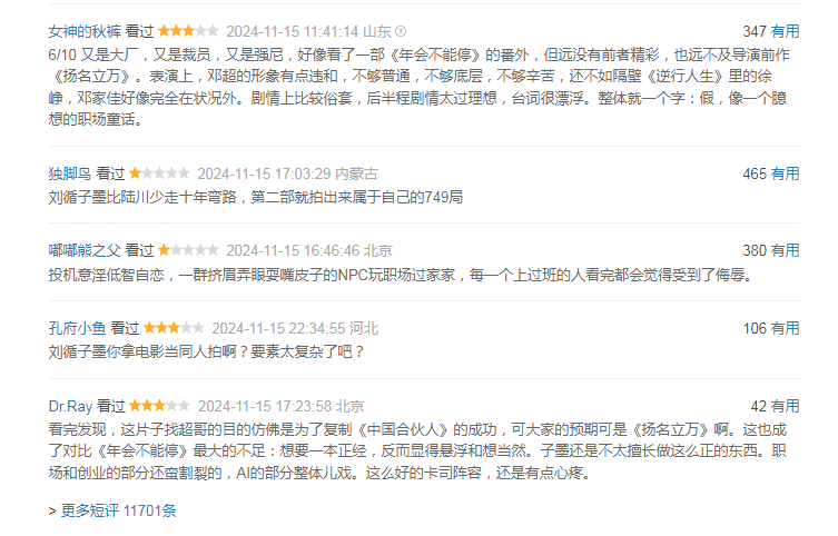 因为问题实在太多,口碑也控制不住了。有观众调侃“刘循子墨比陆川少走十年弯路,第二部就拍出了属于自己的749局”。另一位写的是“投机YY低智自恋,一群挤眉弄眼耍嘴皮子的NPC玩职场过家家,每一个上过班的人看完都会觉得受到了侮辱。”