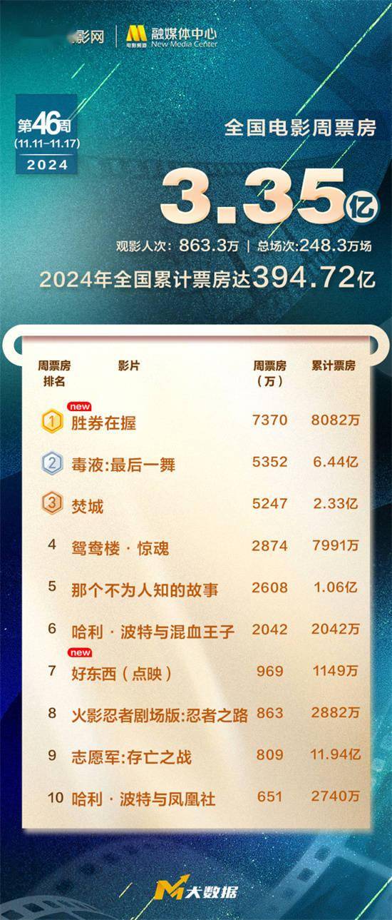 1905电影网讯 2024年第46周(11.11-11.17)全国电影周票房3.35亿元,观影人次超863万,总场次超248万场,2024全年电影票房累计394.72亿元。