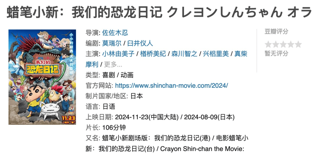 又一部蜡笔小新的剧场版,上一部国内上映的时候,评价还挺好的,看这部的评分,似乎略差一些。但,喜欢蜡笔小新的朋友,也是可以关注下的。