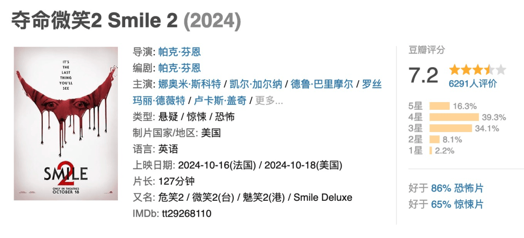 这部之前也推荐过,作为热门恐怖片系列,第二部基本没拉胯,而且评分和票房仍然很不错,这还是挺厉害的。