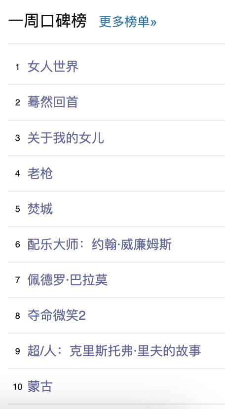 最后,还是例行附上一周豆瓣口碑榜的完整榜单: