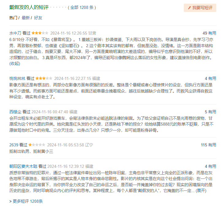 所以说,这部《戴假发的人》属于电影从业者尤其是起步阶段从业者们的一次自嗨,在这次自嗨当中,玩儿了几个所谓的原生家庭悲剧的概念,机械拼接了一些所谓的悬疑故事。普通影迷,一般都不会花钱去看电影人自嗨的内容。电影要想票房成功,得讲普通影迷感兴趣的内容。我们自嗨的,她们不花钱看。