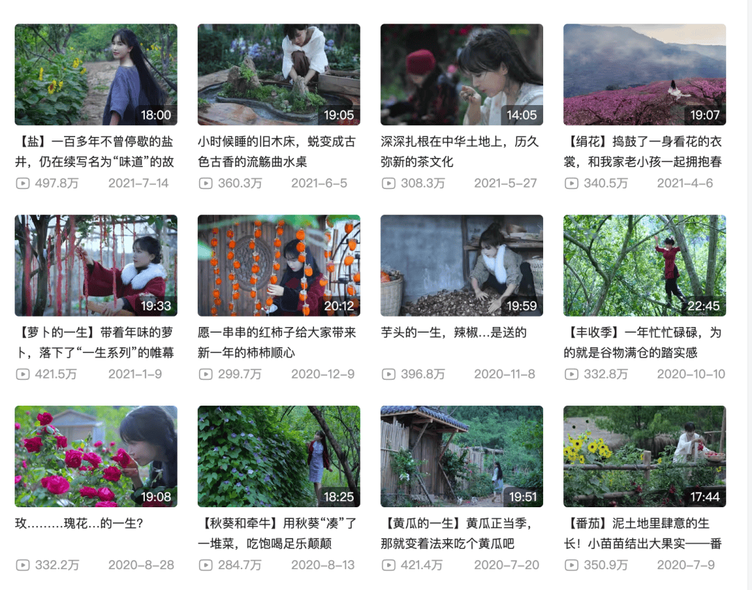 而在众多博主尤其是头部中,李子柒视频更新频率一直偏低,随着名气的增长的,不是李子柒的更新频率,而是她视频记录的时间线:手工艺类的视频,光跟手艺人学习就学了3个多月,到视频剪辑发布花了快半年时间;拍摄文房四宝,整个视频的拍摄周期长达2年。