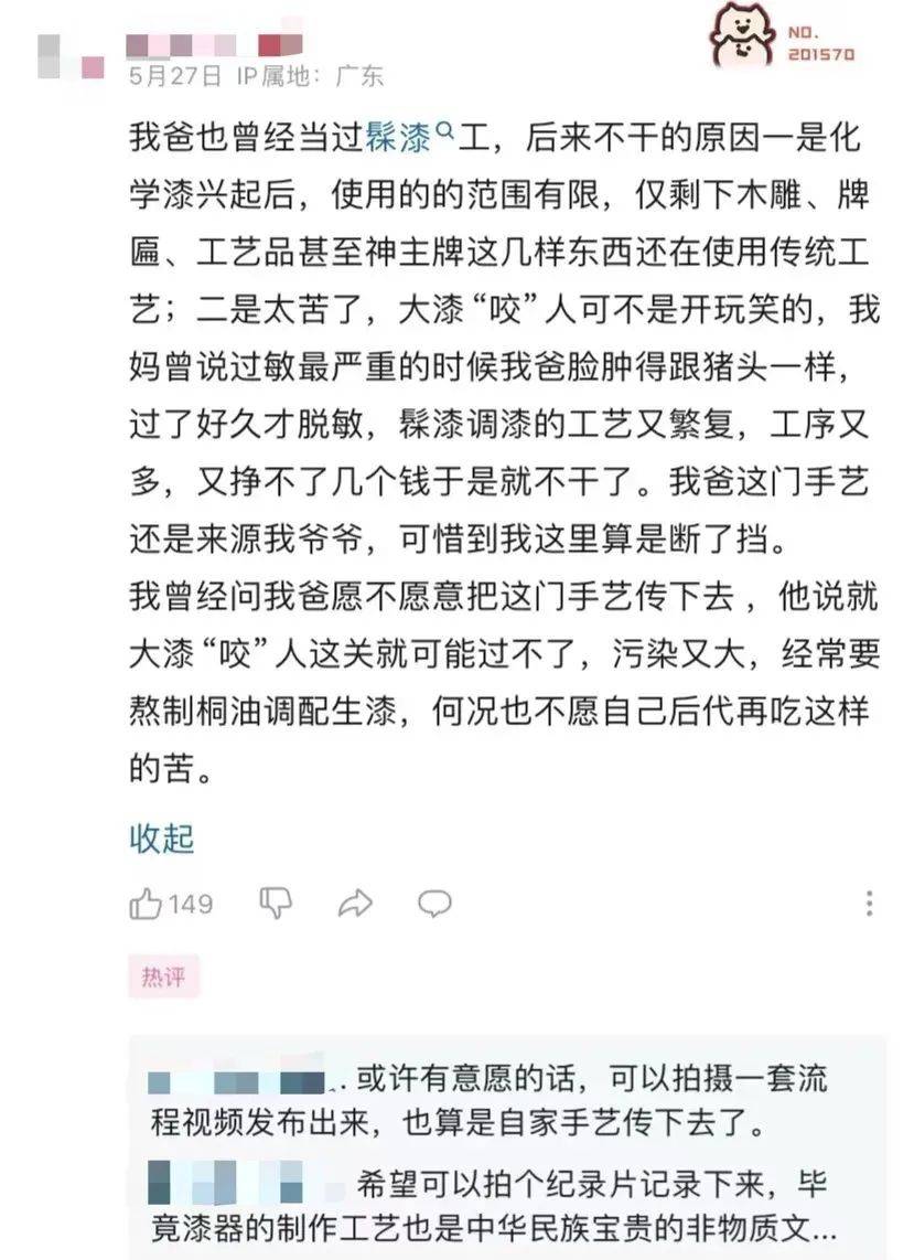 “我爸曾经是髹漆工(漆工),不干的原因一个是化学漆兴起,二是太苦了,大漆“咬”人可不是开玩笑的,我妈曾说过敏最严重的时候我爸脸肿得跟猪头一样,过了好久才脱敏。