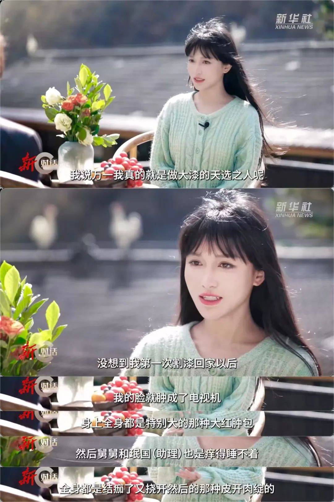 李子柒第一次想到漆器是三四年前,当时她看到某博主的文章分享了”柒“和“漆”互为异体字,“柒是一个会意兼形声字,其中的“七”字既表意也表音,就是将树木的“木”切(“七”)开,流出液体漆的意思。”