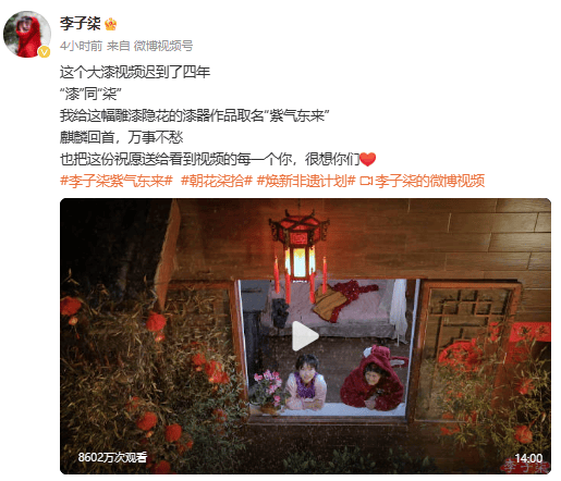 12日,李子柒账号突然更新了一条漆器视频,短短3小时微博浏览量高达8000万,#李子柒回归# #李子柒式美学##这个赛道还得是李子柒#等话题霸榜各平台热搜,今天网友们口中说的最多的一句话,可能是“我的天”和“她又更新了”。