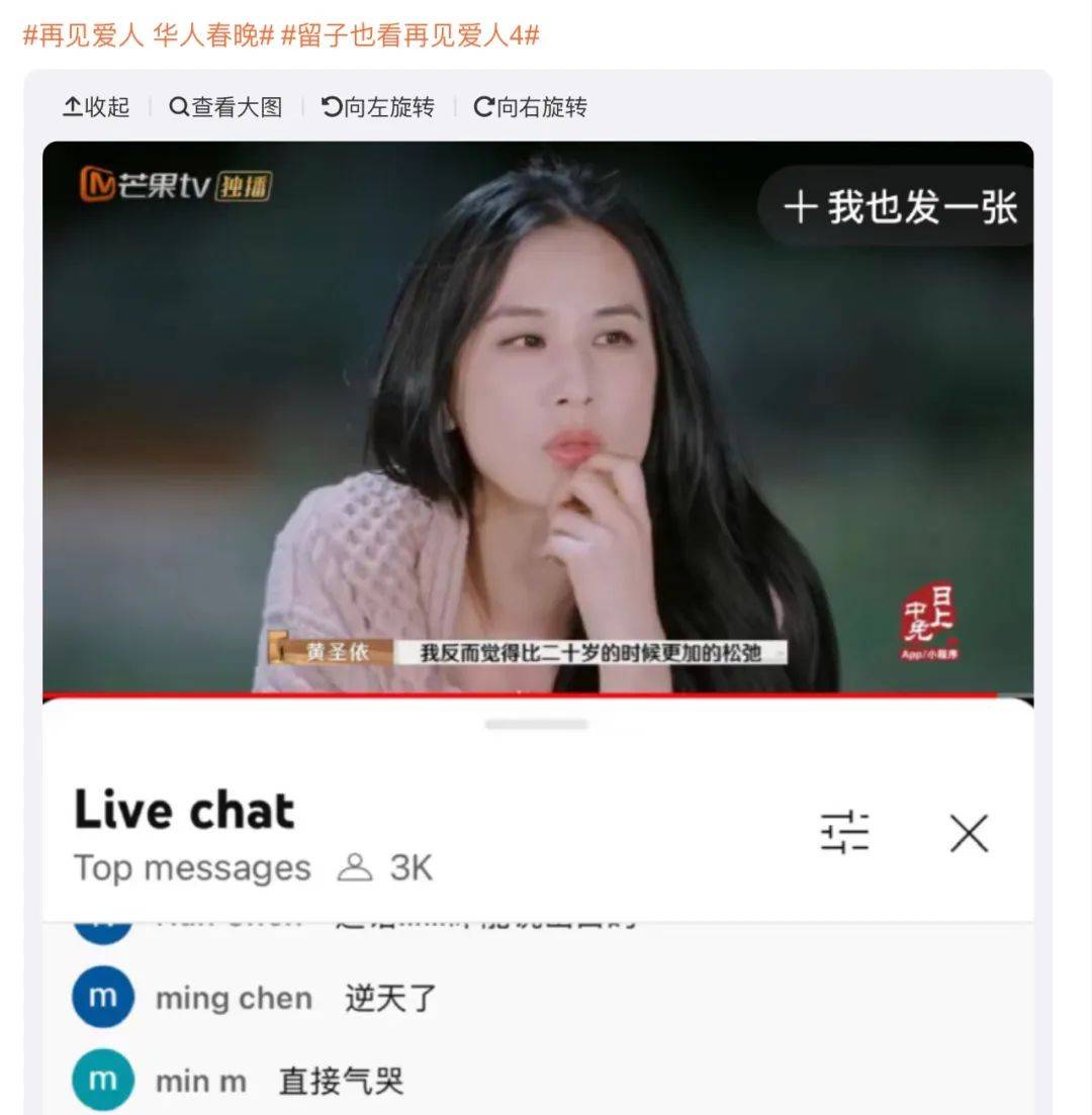 在最近某微博热搜话题 #再见爱人 华人春晚# 下面,有网友分享节目在油管上是首映直播模式,“熏鸡事变”那期吸引了3000 华人观众在线观看发弹幕吐槽,俨然是综艺界华人春晚的狂欢节奏。