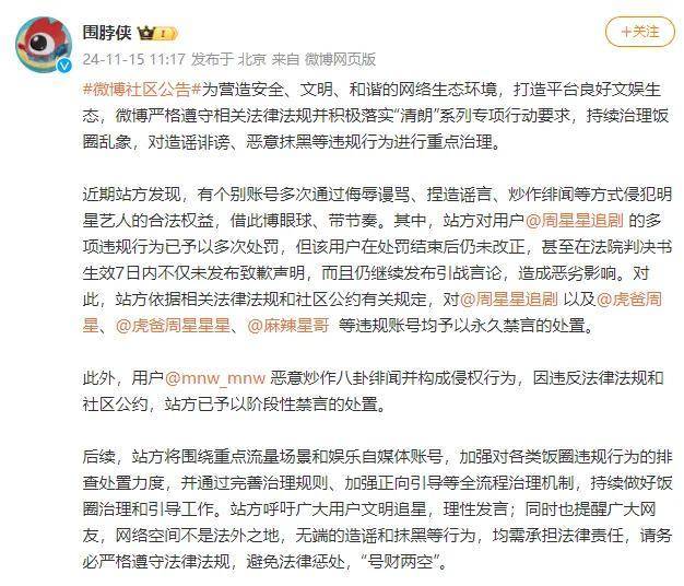 近期站方发现,有个别账号多次通过侮辱谩骂、捏造谣言、炒作绯闻等方式侵犯明星艺人的合法权益,借此博眼球、带节奏。其中,站方对用户@周星星追剧 的多项违规行为已予以多次处罚,但该用户在处罚结束后仍未改正,甚至在法院判决书生效7日内不仅未发布致歉声明,而且仍继续发布引战言论,造成恶劣影响。对此,站方依据相关法律法规和社区公约有关规定,对@周星星追剧 以及@虎爸周星、@虎爸周星星星、@麻辣星哥等违规账号均予以永久禁言的处置。