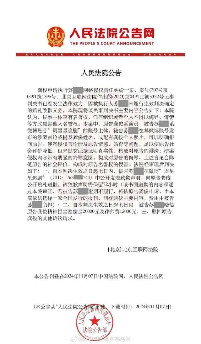 11月7日,记者获悉,因苏某某(微博用户“周星星追剧”)未履行生效判决确定的赔礼致歉义务,北京互联网法院公告龚俊与其网络侵权责任纠纷一案判决书。