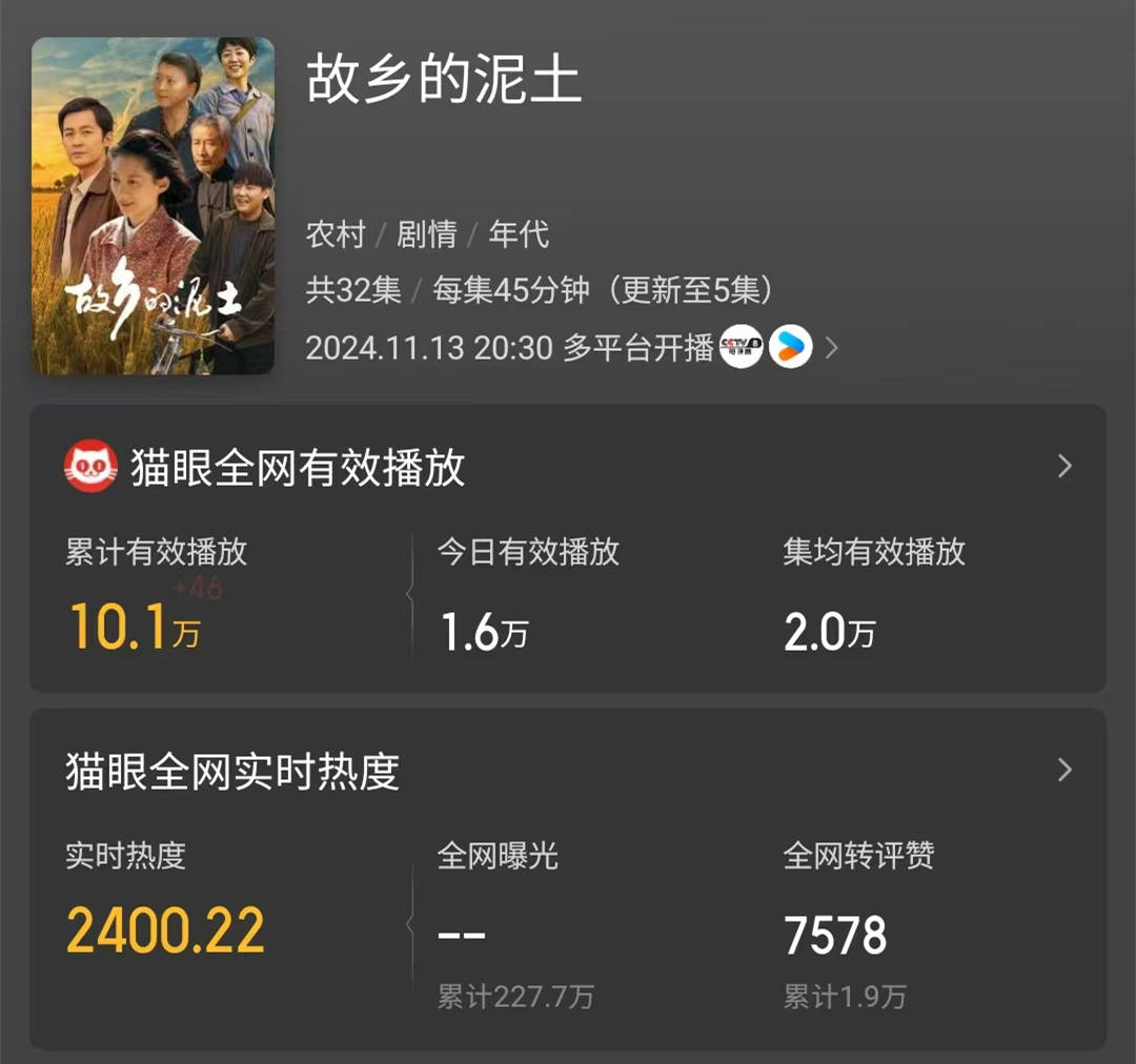 11月16日,电视剧《故乡的泥土》在央八已经连续播出3日,在多家正版视频平台也上线了5集剧情。然而,根据猫眼专业版的数据来看,这部电视剧截至目前的整体累计有效播放量只有10万,集均有效播放量则只有2万。这是一个怎样的扑街概念呢?